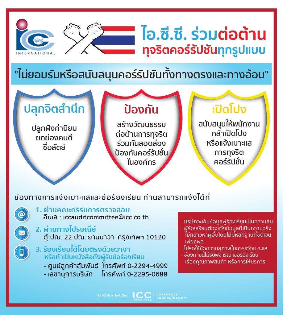 - สารแสดงเจตนารมณ์ต่อต้านการคอร์รัปชัน จากกรรมการผู้อำนวยการ และประธานกรรมการบริหาร